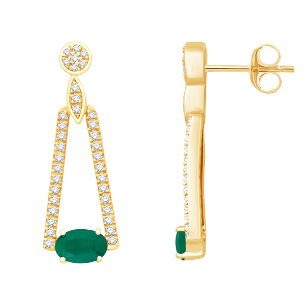 14K YELLOW GOLD DANGLE EARRINGS WITH ROUND DIAMONDS AND BAGUETTE EMERALD