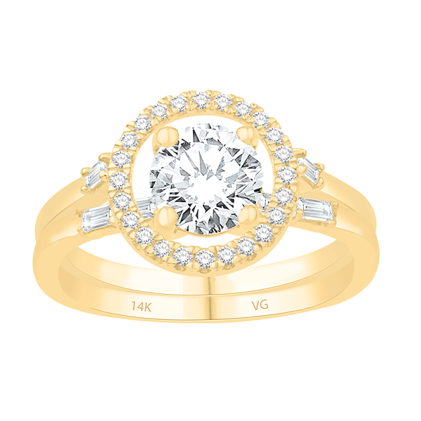 14K YELLOW GOLD ENGAGEMENT RING/WEDDING BAND SET WITH SIDE BAGUETTE AND ROUND DIAMONDS. CENTER STONE IS NOT INCLUDED. THIS IS OUR RING JACKET COLLECTION